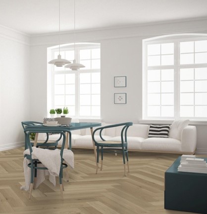 Een PVC visgraat klikvloer is een stijlvolle en duurzame vloer die het klassieke visgraatpatroon combineert met het gemak van een klikverbinding. De planken klikken eenvoudig in elkaar zonder lijm, zijn waterbestendig, geluiddempend en geschikt voor vloerverwarming. Deze visgraat PVC-vloer heeft een zachte eikenkleur die een warme en gezellige sfeer in huis brengt. De natuurlijke tint is veelzijdig en komt prachtig tot zijn recht in zowel moderne als traditionele interieurs. Dankzij de extra matte toplaag krijgen de stroken een luxe, rustige uitstraling die de vloer een rijke en tijdloze look geeft.